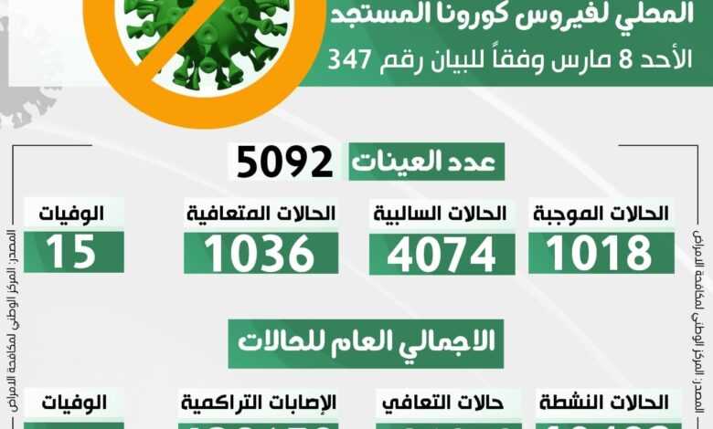 التحديث اليومي للوضع الوبائي المحلي لفيروس كورونا المستجد ليوم الأحد 7 مارس 2021 وفقا للبيان رقم (347)