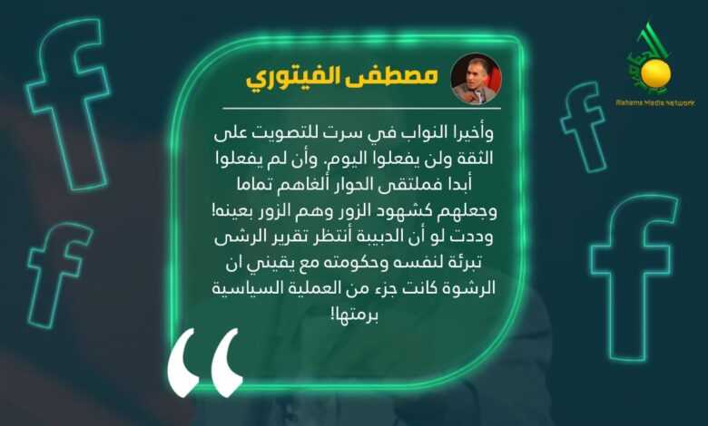 وقال الفيتوري في تدوينة له على فيسبوك “وأخيرا النواب في سرت للتصويت على الثقة ولن يفعلوا اليوم. وأن لم يفعلوا أبدا فملتقى الحوار ألغاهم تماما وجعلهم كشهود الزور وهم الزور بعينه! وددت لو أن الدبيبة أنتظر تقرير الرشى تبرئة لنفسه وحكومته مع يقيني ان الرشوة كانت جزء من العملية السياسية برمتها!”