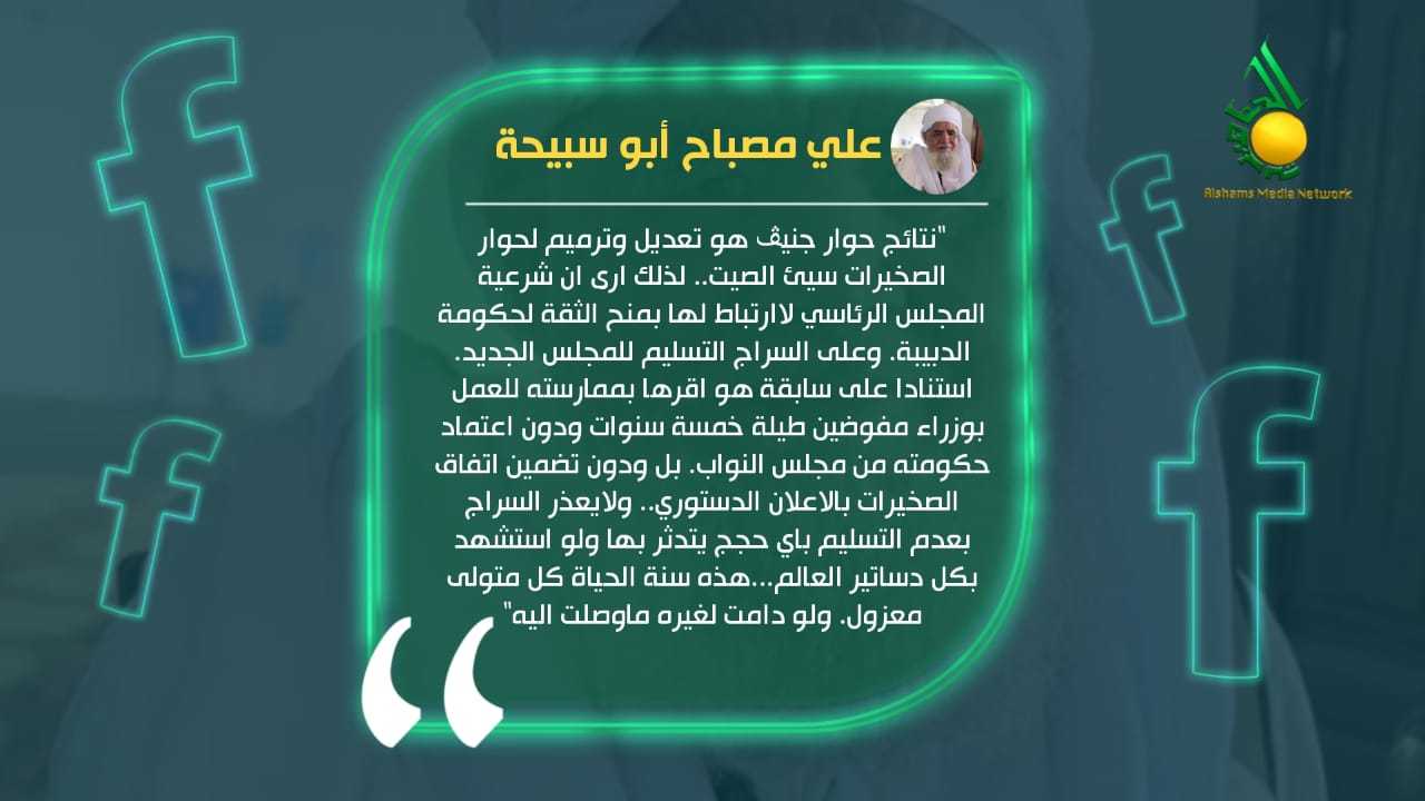 وأضاف أبو سبيحة، ولايعذر السراج بعدم التسليم بأي حجج يتدثر بها ولو استشهد بكل دساتير العالم، هذه سنة الحياة كل متولى معزول، ولو دامت لغيره ماوصلت إليه على حد قوله.