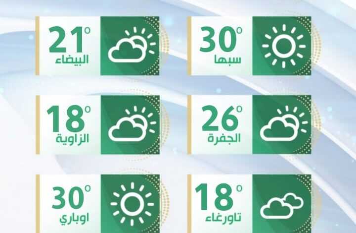 الطقس صافي إلى قليل السحب، والرياح جنوبية شرقية إلى جنوبية، معتدلة السرعة، تنشط أحيانا على السرير وتازربو، قد تسبب في إثارةالأتربة والرمال، ودرجات الحرارة القصوى تتراوح بين 32 و36 درجة مئوية.