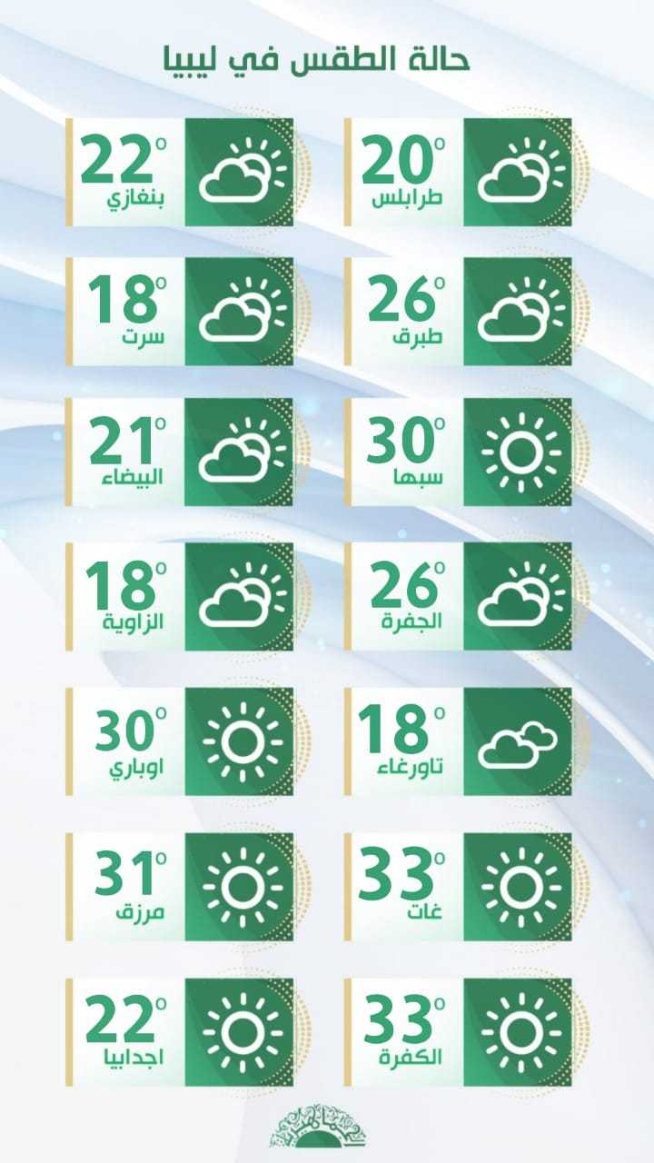 السماء قليلة السحب، تتكاثر أحيانا على بعض المناطق الساحلية والجبل الأخضر، مع احتمال ظهور ضباب خلال الليل، والرياح شماليةغربية إلى شمالية، معتدلة السرعة، بينما تكون جنوبية إلى جنوبية غربية، نشطة السرعة، على مناطق أقصى الساحل الشرقى ، ودرجاتالحرارة القصوى تتراوح بين 20 و24 درجة مئوية، وتبقى مرتفعة على طبرق وجالو والجغبوب حيث تتراوح بين 28 و35 درجة مئوية.
