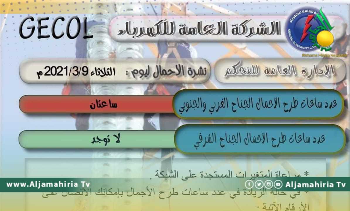 نوهت الشركة العامة للكهرباء أن عدد ساعات طرح الأحمال اليوم الثلاثاء يصل إلى ساعتين في الجناح الغربي والجنوبي