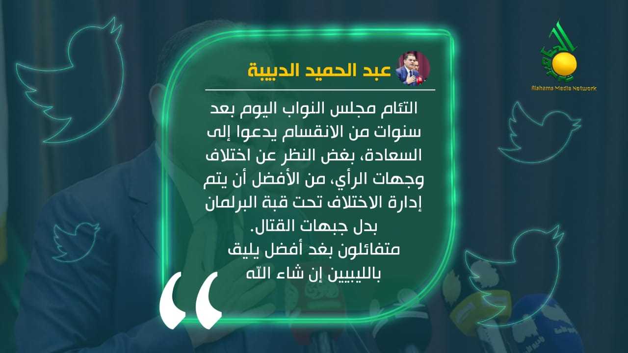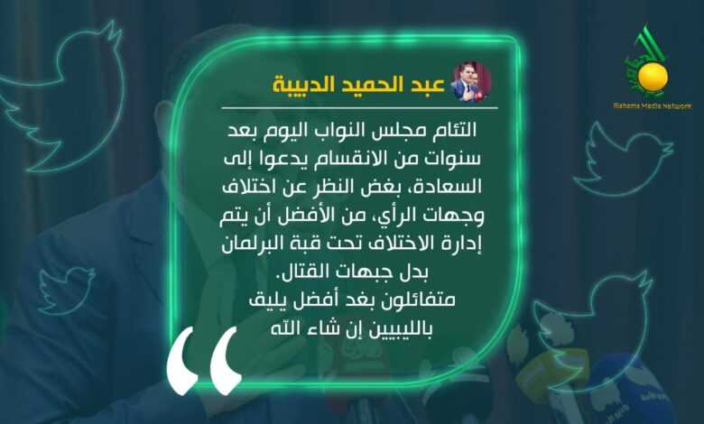 وقال الدبيبة في تغريدة له، إن التئام مجلس النواب اليوم بعد سنوات من الانقسام يدعوا إلى السعادة، بغض النظر عن اختلاف وجهات الرأي، من الأفضل أن يتم إدارة الاختلاف تحت قبة البرلمان بدل جبهات القتال.