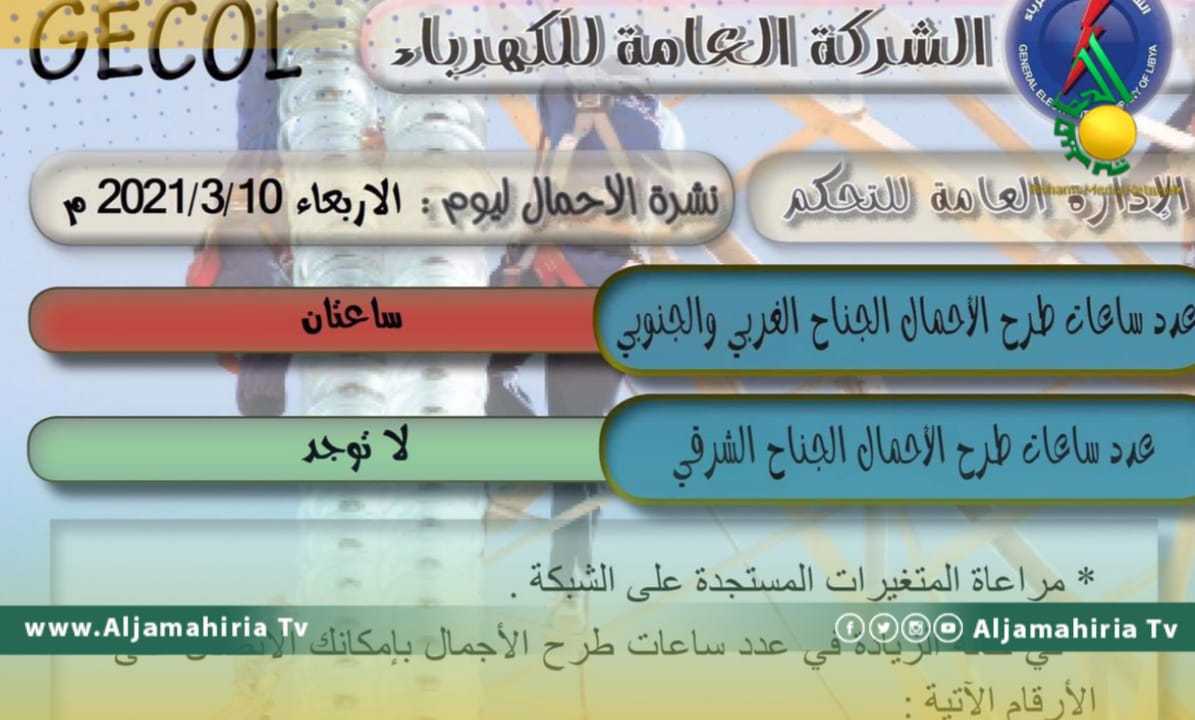 ولن تُطرح أي أحمال، الأربعاء، في الجناح الشرقي، حسب النشرة اليومية لطرح الأحمال، المنشورة على صفحة شركة الكهرباء بموقع «فيسبوك».