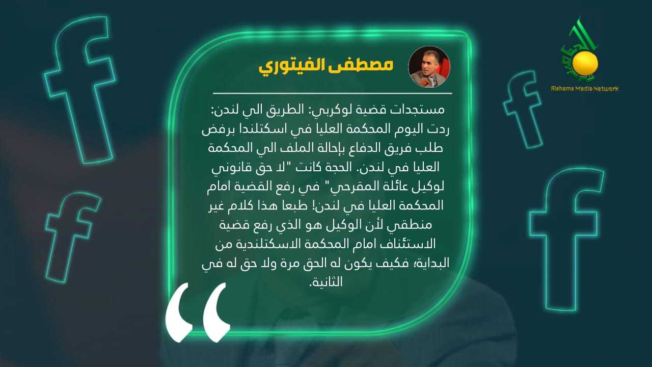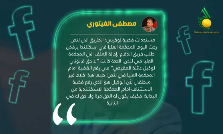 وقال الفيتوري في تدوينة له على صفحته على فيسبوك عنونها بمستجدات قضية لوكيربي: الطريق إلى لندن: ردت اليوم المحكمة العليا في اسكتلندا برفض طلب فريق الدفاع بإحالة الملف الي المحكمة العليا في لندن. الحجة كانت “لا حق قانوني لوكيل عائلة المقرحي” في رفع القضية امام المحكمة العليا في لندن! طبعا هذا كلام غير منطقي لأن الوكيل هو الذي رفع قضية الاستئناف امام المحكمة الأسكتلندية من البداية؛ فكيف يكون له الحق مرة ولا حق له في الثانية.