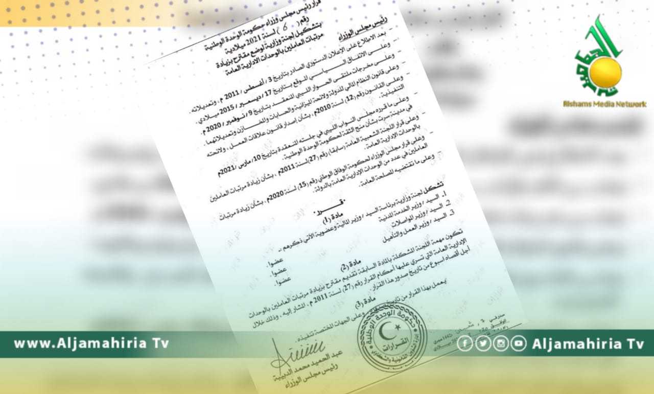 اصدر رئيس حكومة الوحدة المؤقتة عبد الحميد الدبيبة قرارا بتشكيل لجنة برئاسة وزير المالية وعضوية كل من وزراء الخدمة المدنية والمواصلات اضافة الى وزير العمل والتأهيل تختص لوضع مقترح بزيادة المرتبات .