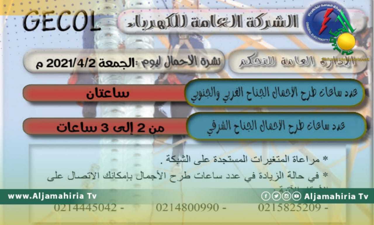تتراوح عدد ساعات طرح الأحمال اليوم الجمعة إلى ما بين 2 و 3 ساعات في مختلف المناطق في ليبيا.