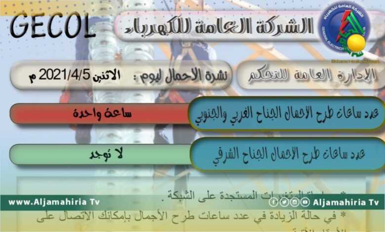 وأوضحت الشركة العامة للكهرباء أن عدد ساعات طرح الأحمال على الجناح الغربي والجنوبي تصل إلى ساعة واحدة، فيما لا توجد ساعات طرح الأحمال في الجناح الشرقي.