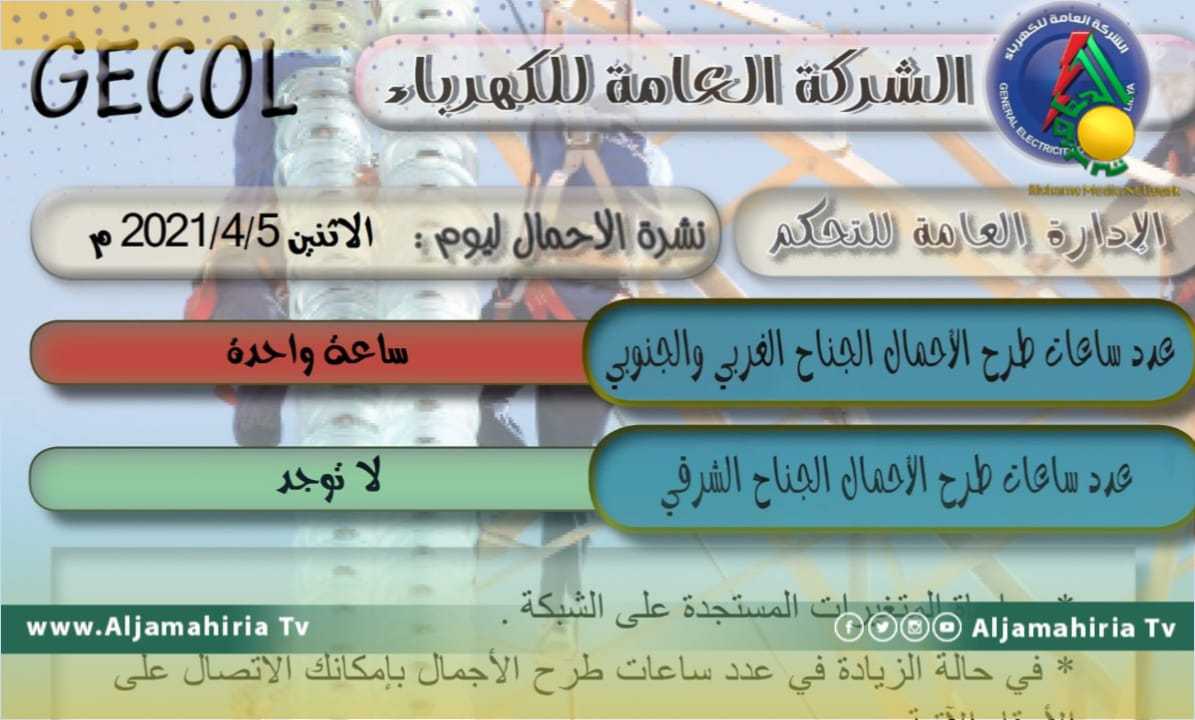 تصل عدد ساعات طرح الأحمال اليوم الاثنين إلى ساعة في مختلف المناطق في ليبيا.