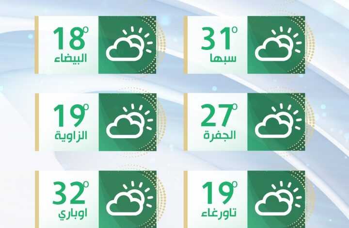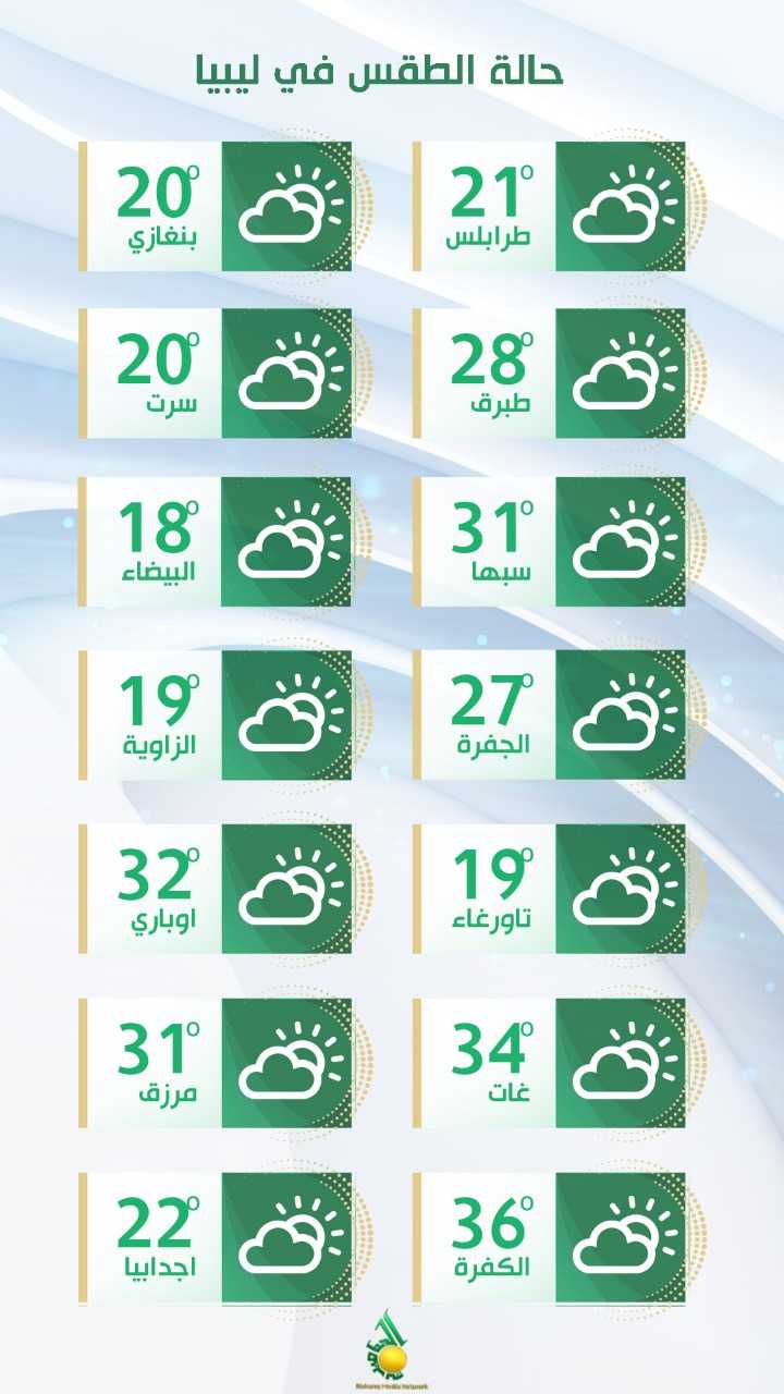السماء صافية إلى قليلة السحب، تتكاثر أحيانا، واحتمال ظهور ضباب خفيف آخر الليلة، والرياح شمالية غربية، معتدلة إلى خفيفة السرعة،وتكون بداية اليوم جنوبية غربية، نشطة السرعة على المنطقة من طبرق حتى أقصى الساحل وجالو والجغبوب، ودرجات الحرارة القصوىتتراوح بين 17 و23 درجة مئوية على غالبية المناطق.