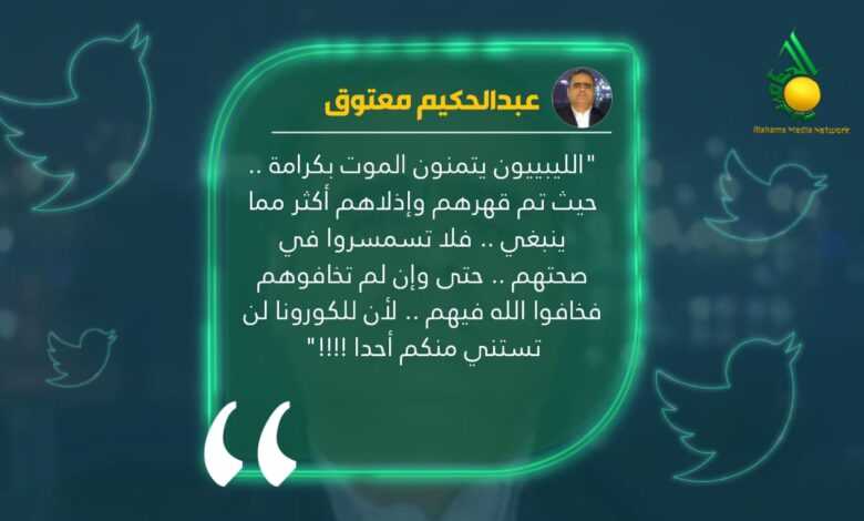 “الليبييون يتمنون الموت بكرامة.. حيث تم قهرهم وإذلاهم أكثر مما ينبغي .. فلا تسمسروا في صحتهم .. حتى وإن لم تخافوهم فخافوا الله فيهم .. لأن الكورونا لن تستثني منكم أحدا !!!!”