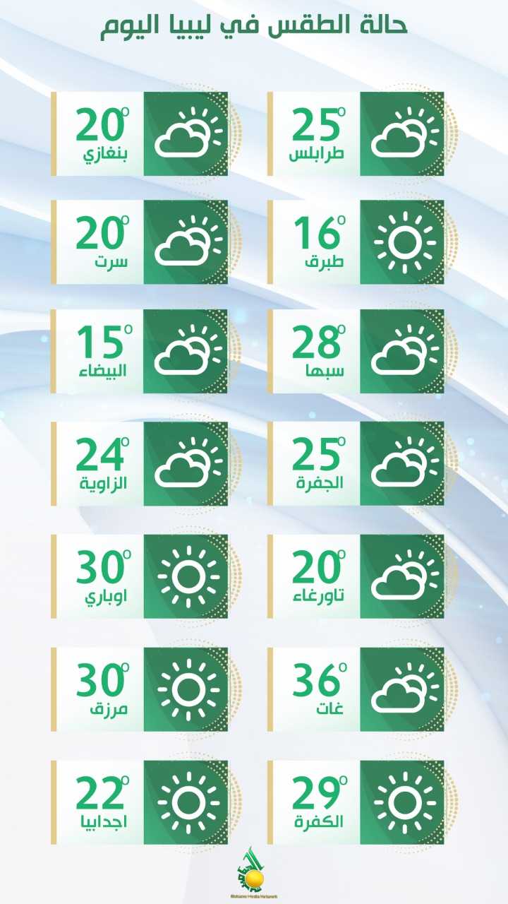 – درجات الحرارة القصوى تتراوح ما بين 17 و24 درجة، ولا تتجاوز 16 درجة على مرتفعات الجبل الأخضر.
