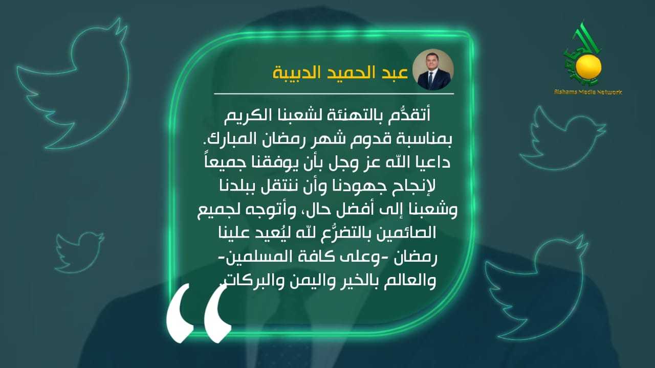 هنأ عبد الحميد الدبيبة، رئيس حكومة الوحدة الوطنية المؤقتة، الليبيين بمناسبة قدوم شهر رمضان المبارك، في تغريدة له على حسابه على موقع التواصل الاجتماعي، تويتر، داعيا الله عز وجل بأن يوفقنا جميعاً لإنجاح جهودنا.