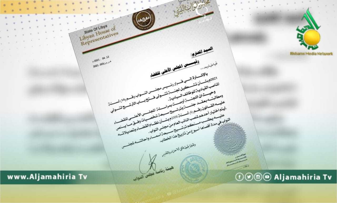 وتضمن الخطاب الموجه من هيئة مجلس النواب للمجلس الأعلى للقضاء ترشيح سبعة أسماء وإحالتهم لمجلس النواب في مدة أقصاها أسبوع من تاريخ الخطاب.