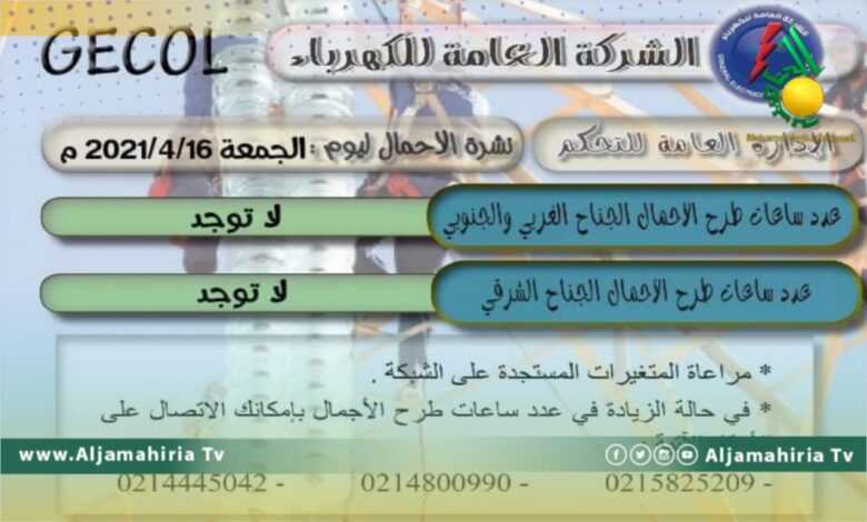 أعلنت دائرة الإعلام بالشركة العامة للكهرباء اليوم الجمعة عبر صفحة الشركة على موقع التواصل الاجتماعي “فيس بوك”.