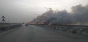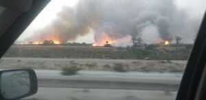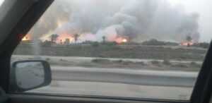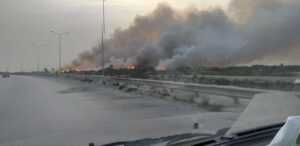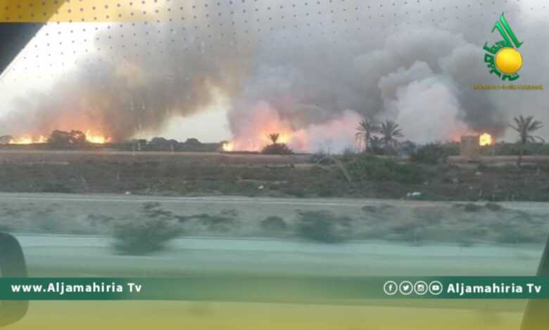 تمددت الحرائق المشتعلة في الأعشاب في منطقة اللثامة بمدينة بنغازي .