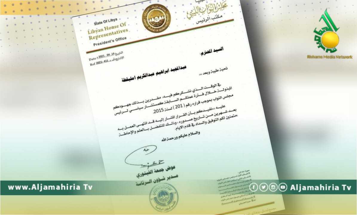 بعد شهرين فقط من تعيينه، ألغى عقيلة صالح رئيس مجلس النواب، قرار تعيين مستشاره السياسي السابق، عبد المجيد إبراهيم امليقطة.