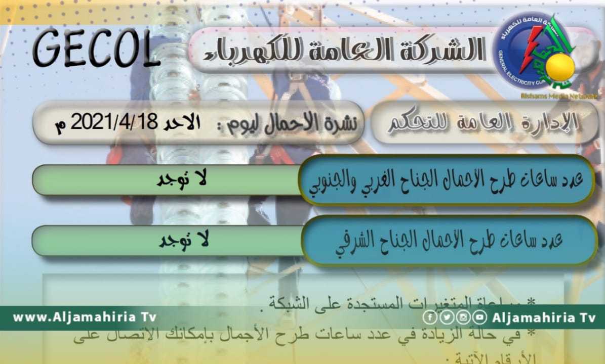 لليوم الرابع على التوالي، أعلنت الشركة العامة للكهرباء، عن عدم وجود ساعات لطرح الأحمال سواء في المنطقة الغربية والجنوبية أو المنطقة الشرقية، وذلك في بيان لها على صفحتها الرسمية على مقع فيس بوك.