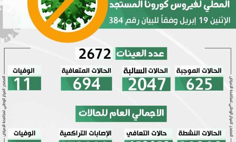 التحديث اليومي للوضع الوبائي المحلي لفيروس كورونا المستجد ليوم الاثنين 19 أبريل 2021