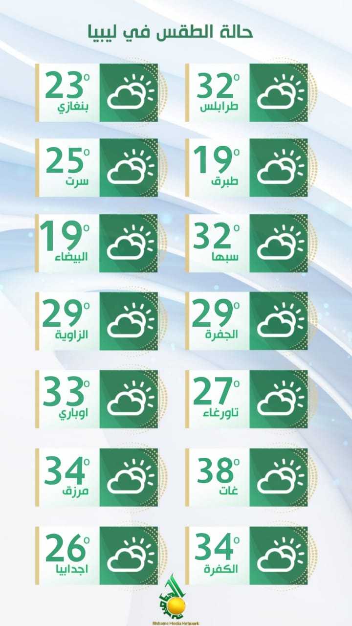 - درجات الحرارة القصوى: تتراوح ما بين (18 – 25) مْ ، وقد تصل إلى (29) مْ على جالو و الجغبوب و اجدابيا وتسجل ارتفاع يوم الغد على اغلب المناطق.