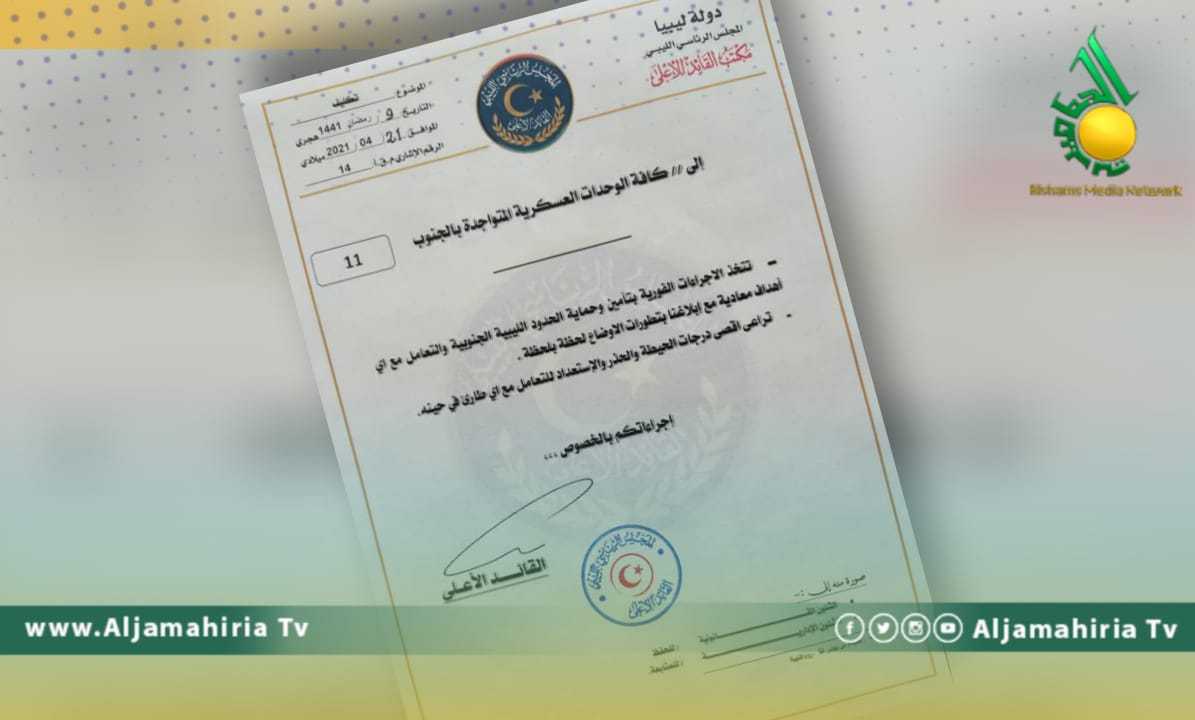 وتضمن القرار الموجه إلى كافة الوحدات العسكرية في الجنوب، ضرورة اتخاذ الإجراءات الفورية بتأمين وحماية الحدود الليبية الجنوبية والتعامل مع أي أهداف معادية مع الإبلاغ بتطورات الأوضاع لحظة بلحظة.