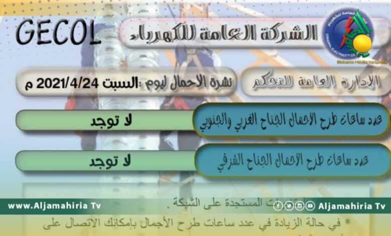 أعلنت دائرة الإعلام بالشركة العامة للكهرباء اليوم السبت عبر صفحة الشركة على موقع التواصل الاجتماعي “فيس بوك”، أنه لا يوجد طرح أحمال خلال ساعات اليوم، واستقرار الشبكة الكهربائية في كامل ربوع البلاد.