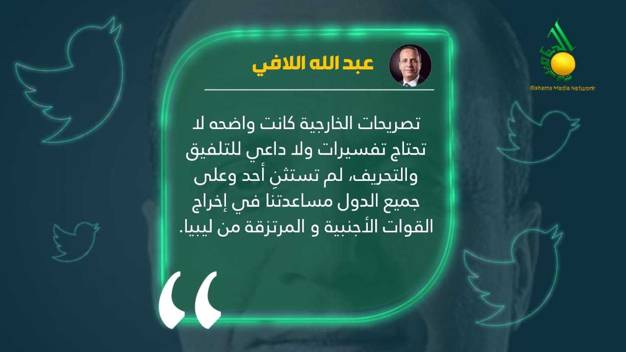 وقال اللافي في تغريدة له على تويتر: تصريحات الخارجية كانت واضحة لا تحتاج تفسيرات ولا داعي للتلفيق والتحريف، لم تستثنِ أحد وعلى جميع الدول مساعدتنا في إخراج القوات الأجنبية و المرتزقة من ليبيا.
