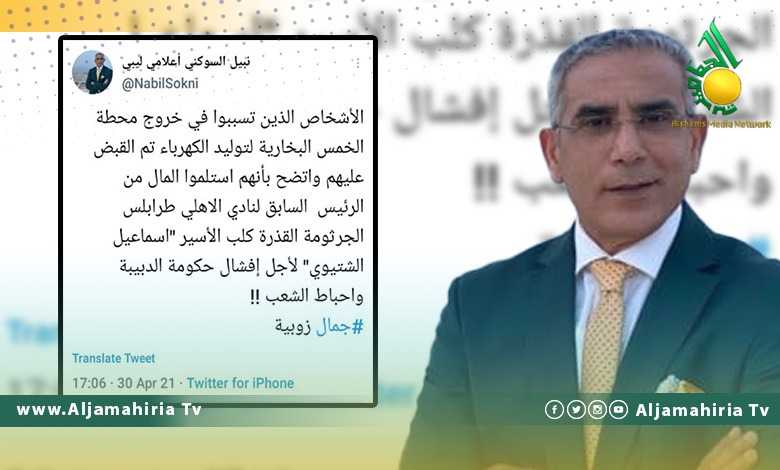 وأوضح السوكني في تغريدة له على شبكة التواصل الإجتماعي تويتر نقلا عن جمال زوبية مدير إدارة الإعلام الخارجي الأسبق ان من تسببوا في خروج محطة الخمس البخارية عن الشبكة استلموا اموالا من الرئيس السابق لنادي الاهلي طرابلس “اسماعيل الشتيوي” لأجل إفشال حكومة الدبيبة واحباط الشعب!!