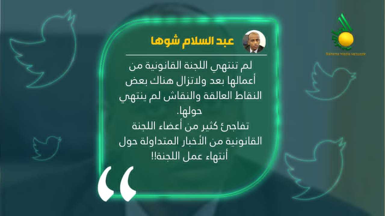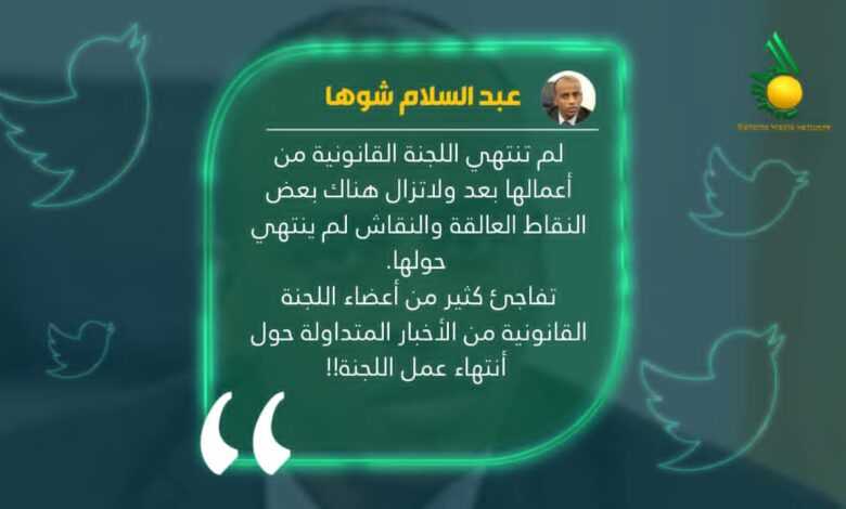 وقال شوها في تغريدة له على تويتر: لم تنتهي اللجنة القانونية من أعمالها بعد ولاتزال هناك بعض النقاط العالقة والنقاش لم ينتهي حولها.