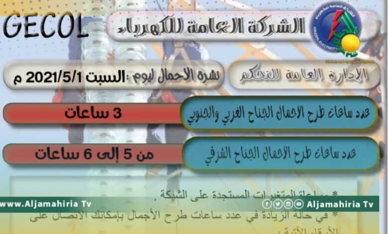 تصل عدد ساعات طرح الأحمال اليوم السبت إلى 6 ساعات في بعض المناطق في ليبيا.