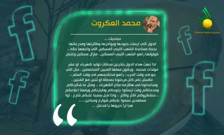 دبلوماسي سابق: طالب الدبلوماسي الليبي السابق محمد العكروت دول حلف شمال الأطلسي الناتو بمساعدة ليبيا في حل أزمة الكهرباء، متهكما في تدوينة عنونها بصباحيات ونشرها على صفحته على فيسبوك، على تلك الدول التي أرسلت جندوها للبلاد بحجة مساعدة الشعب.