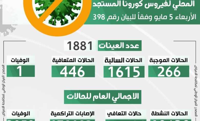 تفاصيل الوضع الوبائي المحلي لفيروس كورونا ليوم الاربعاء 5 مايو