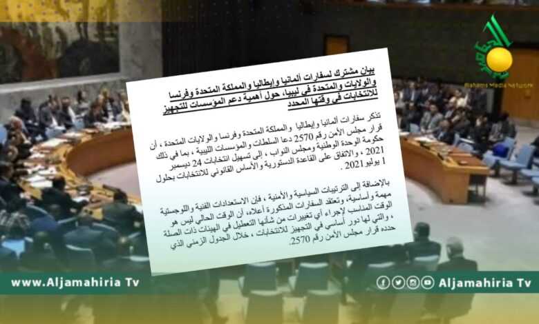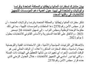 أصدرت سفارات فرنسا وألمانيا وإيطاليا والمملكة المتحدة والولايات المتحدة، بيانا، ذكرت فيه بأن قرار مجلس الأمن رقم 2570، دعا السلطات والمؤسسات الليبية إلى تسهيل إجراء الانتخابات في 24 ديسمبر القادم، والاتفاق على القاعدة الدستورية والأساس القانوني للانتخابات بحلول أول يوليو المقبل.