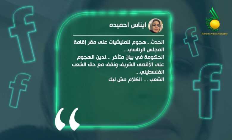 وقالت احميده في تدوينة لها على صفحتها على فيسبوك: الحدث…هجوم للمليشيات على مقر إقامة المجلس الرئاسي…. الحكومة في بيان متأخر …ندين الهجوم على الأقصى الشريف ونقف مع حق الشعب الفلسطيني… الشعب … الكلام مش ليك