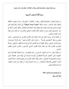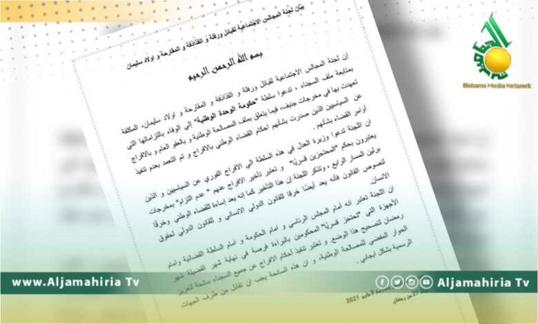 أصدرت لجنة المجالس الاجتماعية لقبائل ورفلة والقذاذفة والمقارحة وأولاد سليمان، المكلفة بمتابعة ملف السجناء، بيانا، السبت، دعت خلاله حكومة الوحدة المؤقتة إلى الوفاء بالتزاماتها التي تعهدت بها في مخرجات جنيف، فيما يتعلق بالمصالحة الوطنية وبالعفو العام، والإفراج عن السياسيين الذين صدرت بشأنهم أحكام قضائية بالإفراج، وتم التعمد بعدم تنفيذها.