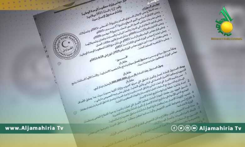 ونص القرار رقم 42 لسنة 2021 على ان يتمتع الصندوق بشخصية اعتبارية وذمة مالية مستقلة بقيمة مليار دينار، ويكون تابعا لمجلس الوزراء ومقره مدينة سرت.