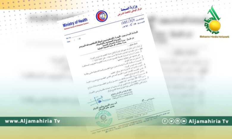 والالتزام بالإجراءات الاحترازية داخل مواقع التطعيم، كما على الطبيب المكلف اجراء التقييم الصحي لمتلقي التطعيم مع ضرورة التقيذ بالدليل الإرشادي لموانع التطعيم، والتنبيه كذلك بضرورة الزام المطعم بالانتظار داخل مركز التطعيم مدة ما بين (15- 30 دقيقة) بعد أخذ التطعيم.