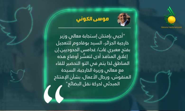 وأعرب الكوني، عن سعادته وامتنانه، في تغريدة له عل حسابه على موقع التواصل الاجتماعي، تويتر، عن إستجابة وزير خارجية الجزائر، صبري بوقادوم للتعجيل بفتح معبري غات/ غدامس الحدوديين.