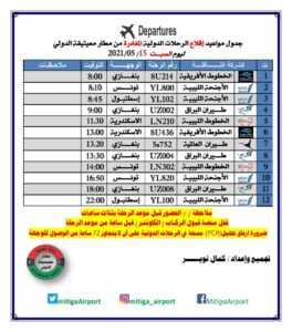 أعلنت إدارة مطاري معيتيقة بالعاصمة طرابلس، وبنينا بمدينة بنغازي، عن مواعيد رحلات الطيران من وإلى المطارين المقررة، السبت، الموافق 15 مايو 2021.