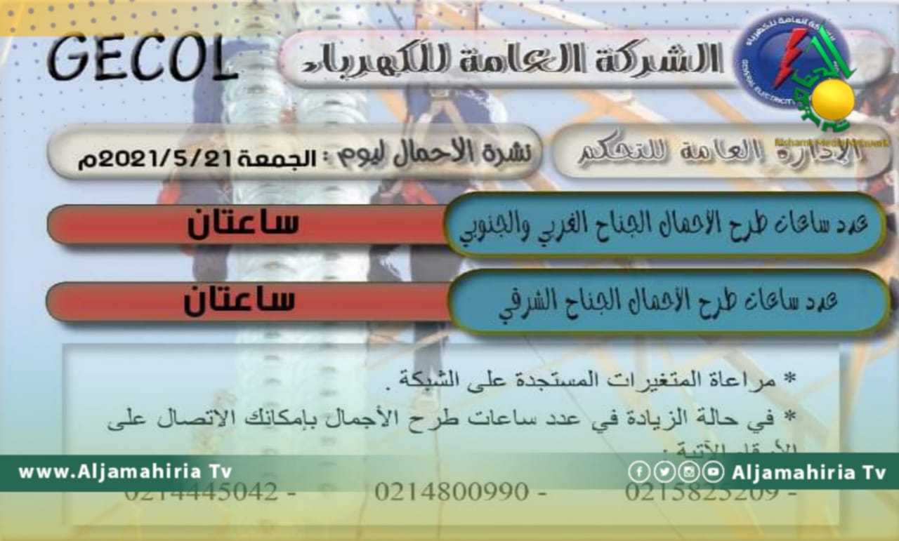 تصل عدد ساعات طرح الأحمال اليوم الجمعة إلى ساعتين في أغلب مناطق ليبيا.