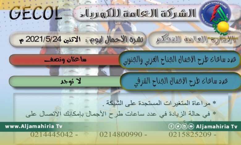 أعلنت الشركة العامة للكهرباء عن عدد ساعات طرح الأحمال اليوم الإثنين والتي تصل إلى ساعتين ونصف للجناح الغربي والجنوبي ولايوجد اي طرح للاحمال في الجناح الشرقي.