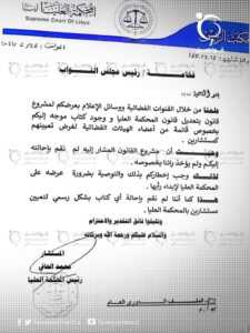 أرسل رئيس المحكمة العليا محمد الحافي، كتابا إلى رئيس مجلس النواب عقيلة صالح، الأربعاء، أخطره خلاله بضرورة تمرير قانون تعديل قانون المحكمة العليا، على المحكمة لإبداء الرأي فيه ثم إحالته إلى رئيس المجلس.