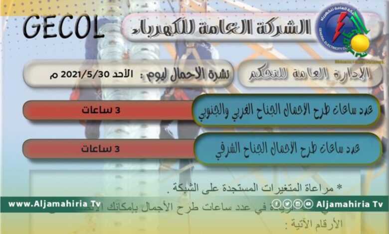 أعلنت الشركة العامة للكهرباء، عن عدد ساعات طرح الاحمال اليوم الأحد 30 مايو 2021 في عموم ليبيا.