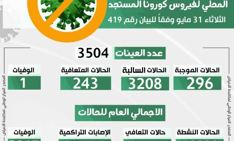 التحديث اليومي للوضع الوبائي المحلي لفيروس كورونا المستجد ليوم الاثنين 31 مايو 2021 م وفقا للبيان رقم (419)