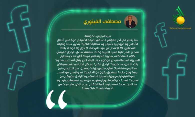 وقال في تدوينة له على صفحته على فيسبوك: “سيادة رئيس حكومتنا.. هنا يعتذر في آخر المؤتمر الصحفي لضيفه الأسباني عن؟ مش أحتلال الأندلس ولا غزو ليبيا لأسبانيا ولا مطالبة “التاغية” بتحرير سبته ومليلة المحتلتين! لا! الإعتذار عن سوء الترجمة! لا حول ولا قوة الا بالله!”.