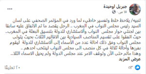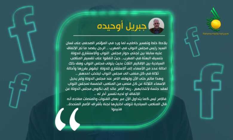 وقال أوحيدة في تدوينة له على فيسبوك: “يلاحظ خلط وتفسير خاطئ لما ورد في المؤتمر الصحفي على لسان السيد رئيس المجلس في المغرب.. الرجل يقصد ما تم الاتفاق عليه سابقا بين لجنتي حوار مجلس النواب والاستشاري للدولة بتنسيق البعثة في المغرب”.