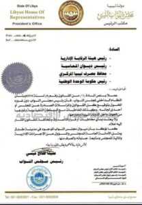 طالب رئيس مجلس النواب ”عقيلة صالح”، بعدم الاعتداد بأي كتاب أو قرار يصدر عن مجلس النواب غير ممهوراً من رئيس مجلس النواب ويعتبر مخالفا لقانون رقم (4) لسنة 2014 .