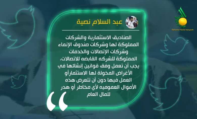 وقال نصية في تغريدة له على تويتر : “الصناديق الاستثمارية والشركات المملوكة لها وشركات صندوق الإنماء وشركات الإتصالات والخدمات المملوكة للشركه القابضه للاتصالات، يجب أن تعمل وفق قوانين إنشائها في الأغراض المخولة لها الاستثمار أو العمل فيها دون أن تتعرض هذه الأموال العموميه لأي مخاطر أو هدر للمال العام