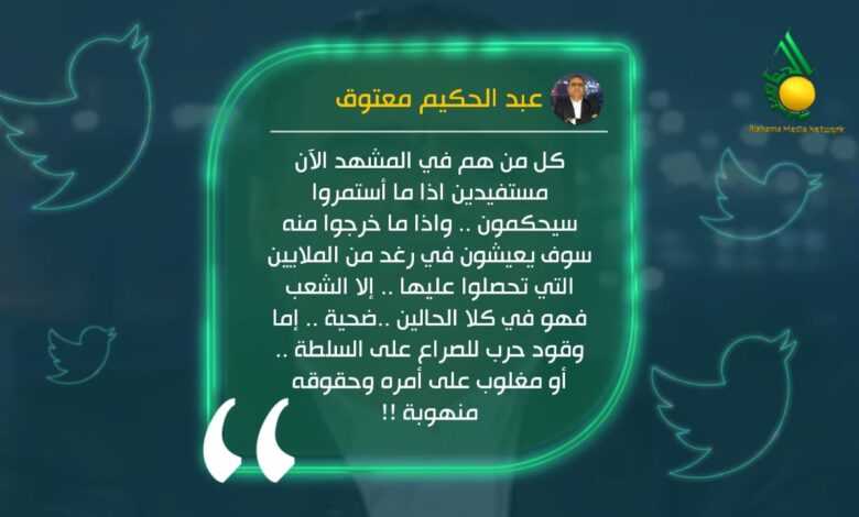 وقال معتوق في تغريدة له على تويتر: “كل من هم في المشهد الآن مستفيدين اذا ما أستمروا سيحكمون .. واذا ما خرجوا منه سوف يعيشون في رغد من الملايين التي تحصلوا عليها .. إلا الشعب فهو في كلا الحالين ..ضحية .. إما وقود حرب للصراع على السلطة .. أو مغلوب على أمره وحقوقه منهوبة !!”
