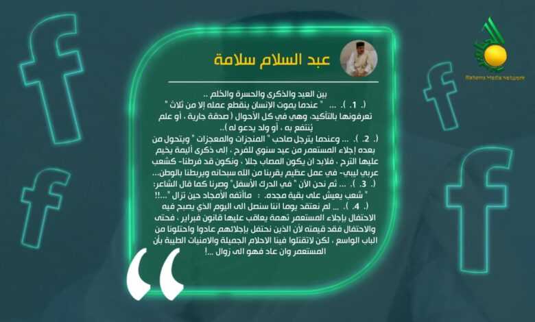 (. 2. ). … وعندما يترجل صاحب ” المنجزات والمعجزات ” ويتحول من بعده إجلاء المستعمر من عيد سنوي للفرح ، إلى ذكرى أليمة يخيم عليها الترح ، فلابد ان يكون المصاب جللا ، ونكون قد فرطنا- كشعب عربي ليبي- في عمل عظيم يقربنا من الله سبحانه ويربطنا بالوطن…